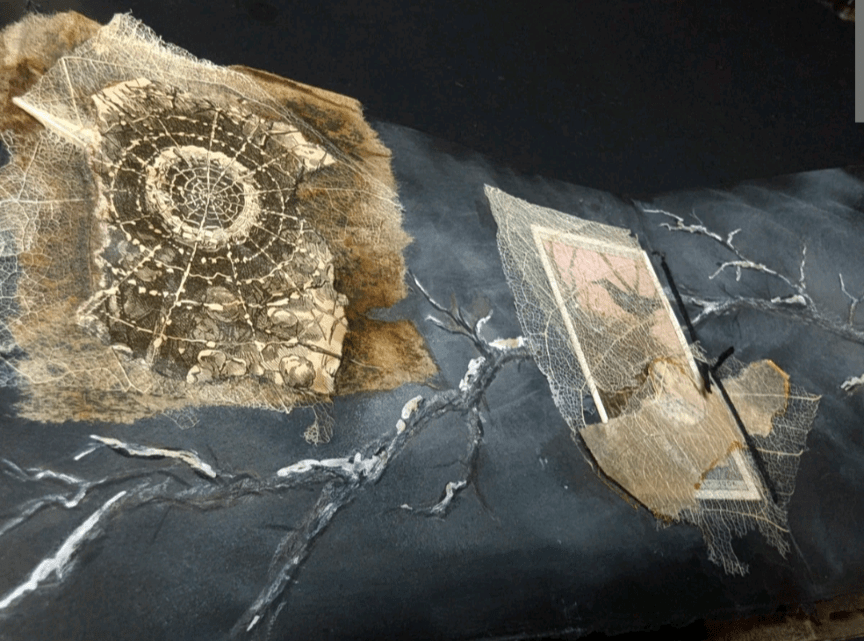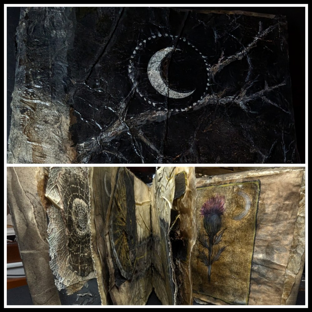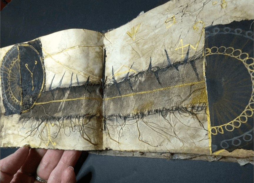 Roots and Thorns – mixed media artist book 4×5 inch handmade book created with plant dyed papers, slow sew work, original painting and drawings. It looks very old, intentionally, like an ancient grimoire. All of the artwork inside -including the small ACEO on the front-is mine with exception to a couple pieces of antique ephemera from my personal collection. Its one of a kind. the roots and thorns theme runs throughout the book on each spread and expressed in different interesting ways.